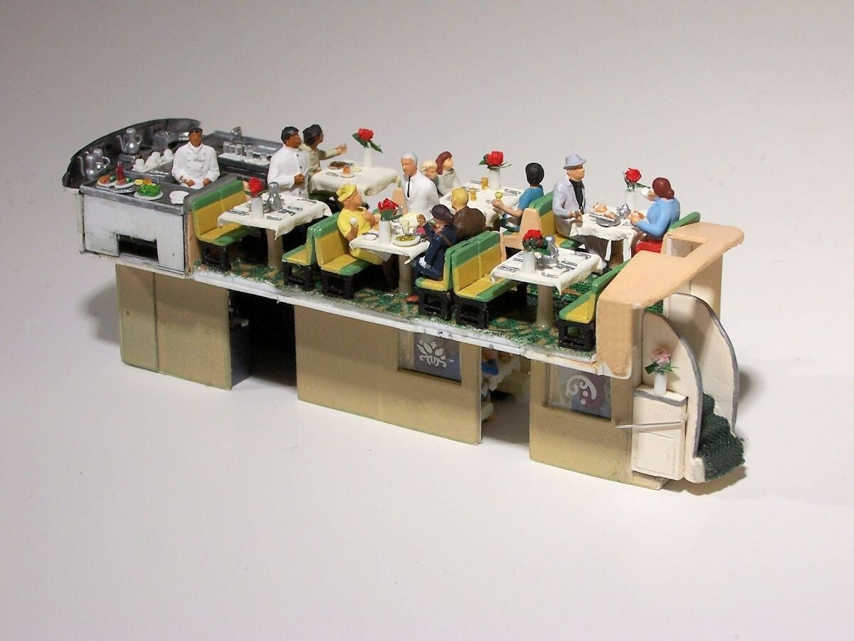 This model features my most advanced and extensive interior detailing to date. Tablecloths, napkins and bar towels were made from Soft Touch Softy 2 ply facial tissue, water and water-based acrylics.