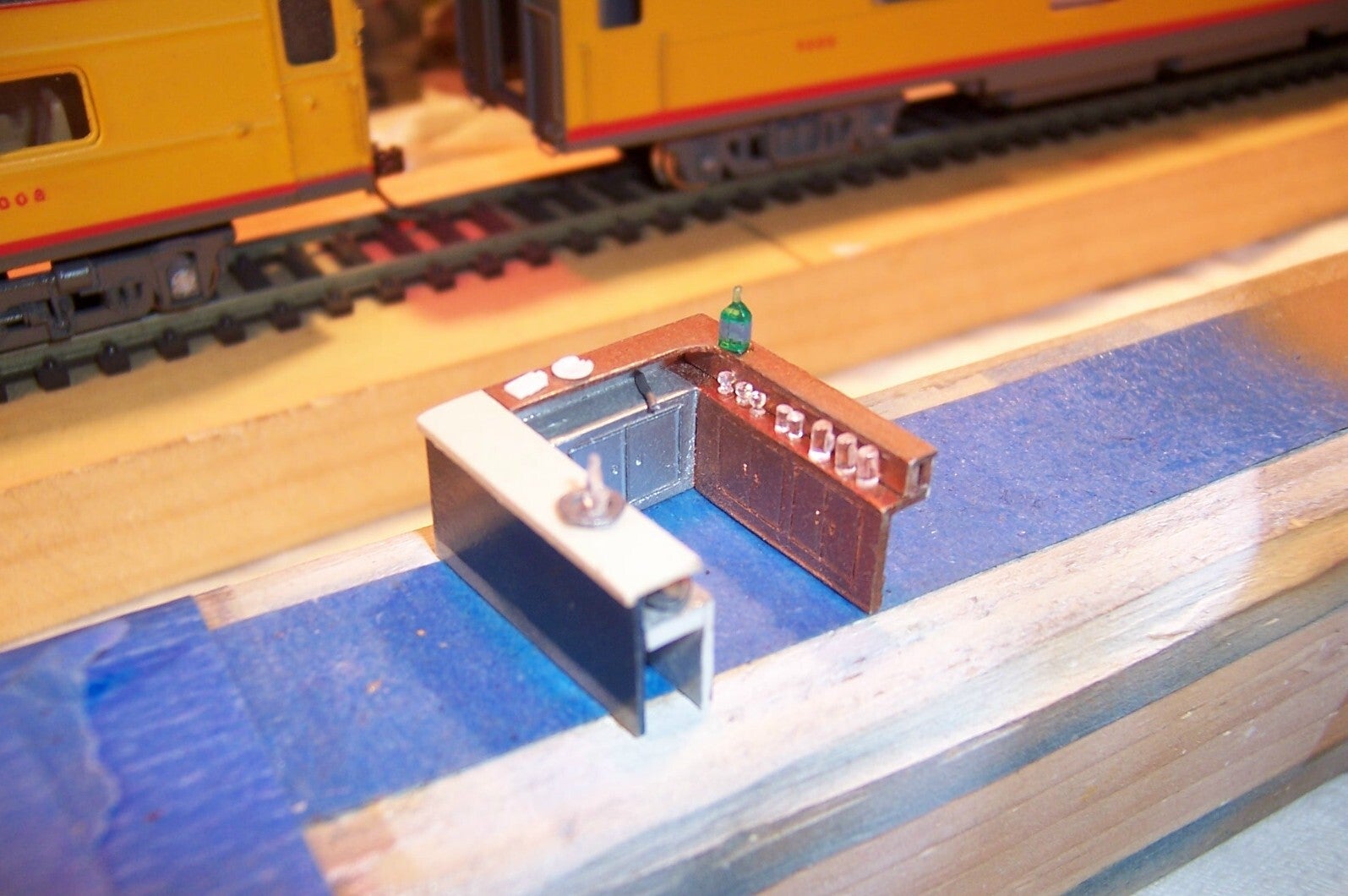 My brass ACF Dome Observation Lounge detailing is complete. The dome divans and card room chairs are Palace Car Co seats that I bashed, with legs from some Red Cap Line chairs. There are 11 different styles of chairs in this car. Both lounge chairs were done by molding and casting, which were fun and easy. Making the masters was the hardest.